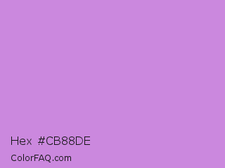 Hex #cb88de Color is a light purple color and the nearest color is Bright Lavender #bf94e4. Hex code #cb88de and RGB value is rgb(203,136,222). In RGB color space, this color is composed of 80% red, 53% green, 87% blue, In CMYK color space, this color is composed of 9% cyan, 39% magenta, 0% yellow , 13% black , In HSL color space, this color has a hue angle of 287° , 57% saturation and 70% lightness.