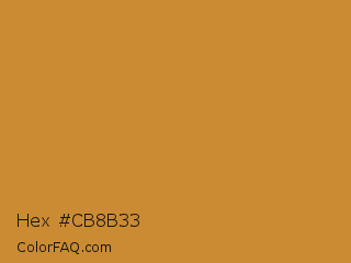 Hex #cb8b33 Color is a normal orange color and the nearest color is Bronze #cd7f32. Hex code #cb8b33 and RGB value is rgb(203,139,51). In RGB color space, this color is composed of 80% red, 55% green, 20% blue, In CMYK color space, this color is composed of 0% cyan, 32% magenta, 75% yellow , 20% black , In HSL color space, this color has a hue angle of 35° , 60% saturation and 50% lightness.