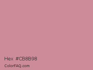 Hex #cb8b98 Color is a light red color and the nearest color is Puce #cc8899. Hex code #cb8b98 and RGB value is rgb(203,139,152). In RGB color space, this color is composed of 80% red, 55% green, 60% blue, In CMYK color space, this color is composed of 0% cyan, 32% magenta, 25% yellow , 20% black , In HSL color space, this color has a hue angle of 348° , 38% saturation and 67% lightness.