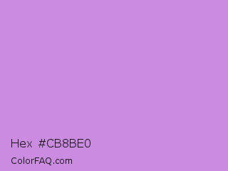 Hex #cb8be0 Color is a light purple color and the nearest color is Bright Lavender #bf94e4. Hex code #cb8be0 and RGB value is rgb(203,139,224). In RGB color space, this color is composed of 80% red, 55% green, 88% blue, In CMYK color space, this color is composed of 9% cyan, 38% magenta, 0% yellow , 12% black , In HSL color space, this color has a hue angle of 285° , 58% saturation and 71% lightness.