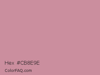 Hex #cb8e9e Color is a light rose color and the nearest color is Puce #cc8899. Hex code #cb8e9e and RGB value is rgb(203,142,158). In RGB color space, this color is composed of 80% red, 56% green, 62% blue, In CMYK color space, this color is composed of 0% cyan, 30% magenta, 22% yellow , 20% black , In HSL color space, this color has a hue angle of 344° , 37% saturation and 68% lightness.