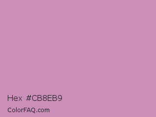 Hex #cb8eb9 Color is a light magenta color and the nearest color is Viola #cb8fa9. Hex code #cb8eb9 and RGB value is rgb(203,142,185). In RGB color space, this color is composed of 80% red, 56% green, 73% blue, In CMYK color space, this color is composed of 0% cyan, 30% magenta, 9% yellow , 20% black , In HSL color space, this color has a hue angle of 318° , 37% saturation and 68% lightness.