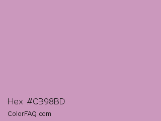 Hex #cb98bd Color is a light magenta color and the nearest color is Pastel Violet #cb99c9. Hex code #cb98bd and RGB value is rgb(203,152,189). In RGB color space, this color is composed of 80% red, 60% green, 74% blue, In CMYK color space, this color is composed of 0% cyan, 25% magenta, 7% yellow , 20% black , In HSL color space, this color has a hue angle of 316° , 33% saturation and 70% lightness.
