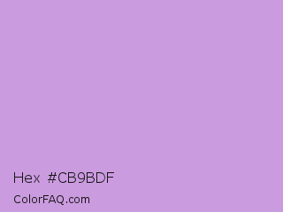 Hex #cb9bdf Color is a light purple color and the nearest color is Light Wisteria #c9a0dc. Hex code #cb9bdf and RGB value is rgb(203,155,223). In RGB color space, this color is composed of 80% red, 61% green, 87% blue, In CMYK color space, this color is composed of 9% cyan, 30% magenta, 0% yellow , 13% black , In HSL color space, this color has a hue angle of 282° , 52% saturation and 74% lightness.