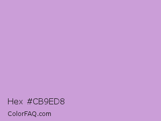 Hex #cb9ed8 Color is a light purple color and the nearest color is Light Wisteria #c9a0dc. Hex code #cb9ed8 and RGB value is rgb(203,158,216). In RGB color space, this color is composed of 80% red, 62% green, 85% blue, In CMYK color space, this color is composed of 6% cyan, 27% magenta, 0% yellow , 15% black , In HSL color space, this color has a hue angle of 287° , 43% saturation and 73% lightness.