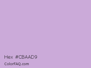 Hex #cbaad9 Color is a light purple color and the nearest color is Tropical Violet #cda4de. Hex code #cbaad9 and RGB value is rgb(203,170,217). In RGB color space, this color is composed of 80% red, 67% green, 85% blue, In CMYK color space, this color is composed of 6% cyan, 22% magenta, 0% yellow , 15% black , In HSL color space, this color has a hue angle of 282° , 38% saturation and 76% lightness.