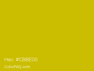 Hex #cbbe00 Color is a normal yellow color and the nearest color is Galliano #dcb20c. Hex code #cbbe00 and RGB value is rgb(203,190,0). In RGB color space, this color is composed of 80% red, 75% green, 0% blue, In CMYK color space, this color is composed of 0% cyan, 6% magenta, 100% yellow , 20% black , In HSL color space, this color has a hue angle of 56° , 100% saturation and 40% lightness.