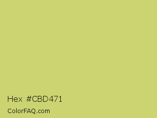Hex #cbd471 Color is a light yellow color and the nearest color is Yellow Green #c5e17a. Hex code #cbd471 and RGB value is rgb(203,212,113). In RGB color space, this color is composed of 80% red, 83% green, 44% blue, In CMYK color space, this color is composed of 4% cyan, 0% magenta, 47% yellow , 17% black , In HSL color space, this color has a hue angle of 65° , 54% saturation and 64% lightness.
