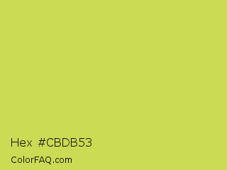 Hex #cbdb53 Color is a normal yellow color and the nearest color is June Bud #bdda57. Hex code #cbdb53 and RGB value is rgb(203,219,83). In RGB color space, this color is composed of 80% red, 86% green, 33% blue, In CMYK color space, this color is composed of 7% cyan, 0% magenta, 62% yellow , 14% black , In HSL color space, this color has a hue angle of 67° , 65% saturation and 59% lightness.