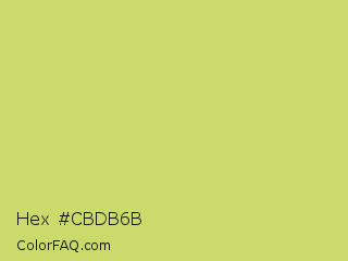 Hex #cbdb6b Color is a light yellow color and the nearest color is Yellow Green #c5e17a. Hex code #cbdb6b and RGB value is rgb(203,219,107). In RGB color space, this color is composed of 80% red, 86% green, 42% blue, In CMYK color space, this color is composed of 7% cyan, 0% magenta, 51% yellow , 14% black , In HSL color space, this color has a hue angle of 69° , 61% saturation and 64% lightness.