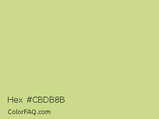 Hex #cbdb8b Color is a light lime color and the nearest color is Medium Spring Bud #c9dc87. Hex code #cbdb8b and RGB value is rgb(203,219,139). In RGB color space, this color is composed of 80% red, 86% green, 55% blue, In CMYK color space, this color is composed of 7% cyan, 0% magenta, 37% yellow , 14% black , In HSL color space, this color has a hue angle of 72° , 53% saturation and 70% lightness.