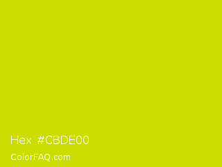 Hex #cbde00 Color is a normal yellow color and the nearest color is Bitter Lemon #cae00d. Hex code #cbde00 and RGB value is rgb(203,222,0). In RGB color space, this color is composed of 80% red, 87% green, 0% blue, In CMYK color space, this color is composed of 9% cyan, 0% magenta, 100% yellow , 13% black , In HSL color space, this color has a hue angle of 65° , 100% saturation and 44% lightness.