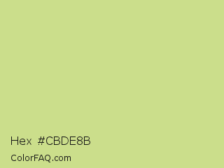 Hex #cbde8b Color is a light lime color and the nearest color is Medium Spring Bud #c9dc87. Hex code #cbde8b and RGB value is rgb(203,222,139). In RGB color space, this color is composed of 80% red, 87% green, 55% blue, In CMYK color space, this color is composed of 9% cyan, 0% magenta, 37% yellow , 13% black , In HSL color space, this color has a hue angle of 74° , 56% saturation and 71% lightness.
