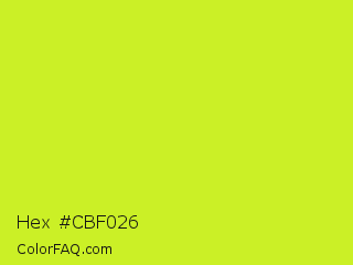 Hex #cbf026 Color is a normal lime color and the nearest color is Pear #d1e231. Hex code #cbf026 and RGB value is rgb(203,240,38). In RGB color space, this color is composed of 80% red, 94% green, 15% blue, In CMYK color space, this color is composed of 15% cyan, 0% magenta, 84% yellow , 6% black , In HSL color space, this color has a hue angle of 71° , 87% saturation and 55% lightness.