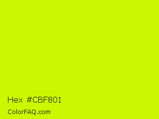 Hex #cbf801 Color is a normal lime color and the nearest color is Electric Lime #ccff00. Hex code #cbf801 and RGB value is rgb(203,248,1). In RGB color space, this color is composed of 80% red, 97% green, 0% blue, In CMYK color space, this color is composed of 18% cyan, 0% magenta, 100% yellow , 3% black , In HSL color space, this color has a hue angle of 71° , 99% saturation and 49% lightness.
