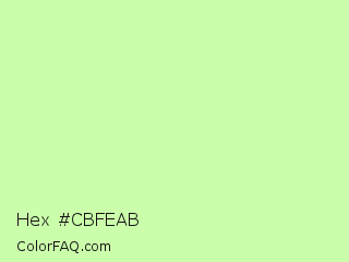 Hex #cbfeab Color is a very light green color and the nearest color is Reef #c9ffa2. Hex code #cbfeab and RGB value is rgb(203,254,171). In RGB color space, this color is composed of 80% red, 100% green, 67% blue, In CMYK color space, this color is composed of 20% cyan, 0% magenta, 33% yellow , 0% black , In HSL color space, this color has a hue angle of 97° , 98% saturation and 83% lightness.