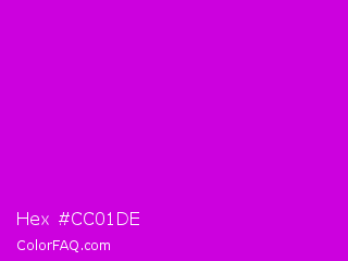 Hex #cc01de Color is a normal magenta color and the nearest color is Deep Magenta #cc00cc. Hex code #cc01de and RGB value is rgb(204,1,222). In RGB color space, this color is composed of 80% red, 0% green, 87% blue, In CMYK color space, this color is composed of 8% cyan, 100% magenta, 0% yellow , 13% black , In HSL color space, this color has a hue angle of 295° , 99% saturation and 44% lightness.