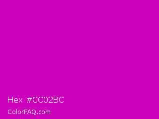 Hex #cc02bc Color is a normal magenta color and the nearest color is Deep Magenta #cc00cc. Hex code #cc02bc and RGB value is rgb(204,2,188). In RGB color space, this color is composed of 80% red, 1% green, 74% blue, In CMYK color space, this color is composed of 0% cyan, 99% magenta, 8% yellow , 20% black , In HSL color space, this color has a hue angle of 305° , 98% saturation and 40% lightness.