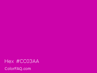 Hex #cc03aa Color is a normal magenta color and the nearest color is Deep Magenta #cc00cc. Hex code #cc03aa and RGB value is rgb(204,3,170). In RGB color space, this color is composed of 80% red, 1% green, 67% blue, In CMYK color space, this color is composed of 0% cyan, 99% magenta, 17% yellow , 20% black , In HSL color space, this color has a hue angle of 310° , 97% saturation and 41% lightness.