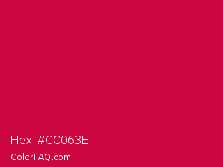 Hex #cc063e Color is a normal rose color and the nearest color is Utah Crimson #d3003f. Hex code #cc063e and RGB value is rgb(204,6,62). In RGB color space, this color is composed of 80% red, 2% green, 24% blue, In CMYK color space, this color is composed of 0% cyan, 97% magenta, 70% yellow , 20% black , In HSL color space, this color has a hue angle of 343° , 94% saturation and 41% lightness.