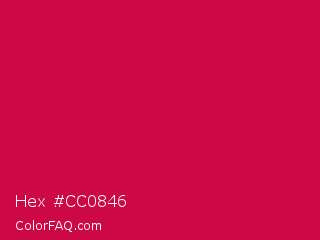 Hex #cc0846 Color is a normal rose color and the nearest color is Spanish Carmine #d10047. Hex code #cc0846 and RGB value is rgb(204,8,70). In RGB color space, this color is composed of 80% red, 3% green, 27% blue, In CMYK color space, this color is composed of 0% cyan, 96% magenta, 66% yellow , 20% black , In HSL color space, this color has a hue angle of 341° , 92% saturation and 42% lightness.