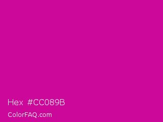 Hex #cc089b Color is a normal magenta color and the nearest color is Red Violet #c71585. Hex code #cc089b and RGB value is rgb(204,8,155). In RGB color space, this color is composed of 80% red, 3% green, 61% blue, In CMYK color space, this color is composed of 0% cyan, 96% magenta, 24% yellow , 20% black , In HSL color space, this color has a hue angle of 315° , 92% saturation and 42% lightness.