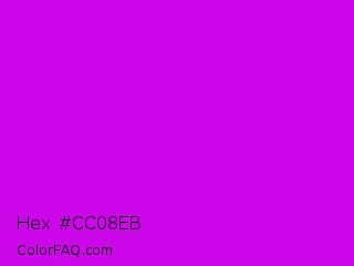 Hex #cc08eb Color is a normal magenta color and the nearest color is Vivid Orchid #cc00ff. Hex code #cc08eb and RGB value is rgb(204,8,235). In RGB color space, this color is composed of 80% red, 3% green, 92% blue, In CMYK color space, this color is composed of 13% cyan, 97% magenta, 0% yellow , 8% black , In HSL color space, this color has a hue angle of 292° , 93% saturation and 48% lightness.