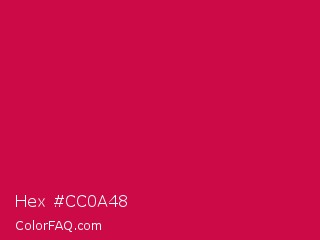 Hex #cc0a48 Color is a normal rose color and the nearest color is Pictorial Carmine #c30b4e. Hex code #cc0a48 and RGB value is rgb(204,10,72). In RGB color space, this color is composed of 80% red, 4% green, 28% blue, In CMYK color space, this color is composed of 0% cyan, 95% magenta, 65% yellow , 20% black , In HSL color space, this color has a hue angle of 341° , 91% saturation and 42% lightness.