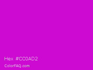 Hex #cc0ad2 Color is a normal magenta color and the nearest color is Deep Magenta #cc00cc. Hex code #cc0ad2 and RGB value is rgb(204,10,210). In RGB color space, this color is composed of 80% red, 4% green, 82% blue, In CMYK color space, this color is composed of 3% cyan, 95% magenta, 0% yellow , 18% black , In HSL color space, this color has a hue angle of 298° , 91% saturation and 43% lightness.