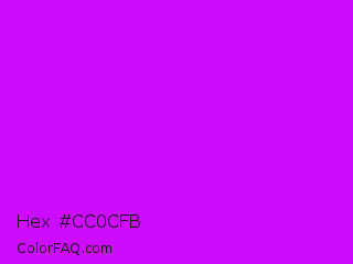 Hex #cc0cfb Color is a normal purple color and the nearest color is Vivid Orchid #cc00ff. Hex code #cc0cfb and RGB value is rgb(204,12,251). In RGB color space, this color is composed of 80% red, 5% green, 98% blue, In CMYK color space, this color is composed of 19% cyan, 95% magenta, 0% yellow , 2% black , In HSL color space, this color has a hue angle of 288° , 97% saturation and 52% lightness.