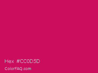 Hex #cc0d5d Color is a normal rose color and the nearest color is Debian Red #d70a53. Hex code #cc0d5d and RGB value is rgb(204,13,93). In RGB color space, this color is composed of 80% red, 5% green, 36% blue, In CMYK color space, this color is composed of 0% cyan, 94% magenta, 54% yellow , 20% black , In HSL color space, this color has a hue angle of 335° , 88% saturation and 43% lightness.