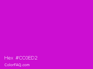Hex #cc0ed2 Color is a normal magenta color and the nearest color is Deep Magenta #cc00cc. Hex code #cc0ed2 and RGB value is rgb(204,14,210). In RGB color space, this color is composed of 80% red, 5% green, 82% blue, In CMYK color space, this color is composed of 3% cyan, 93% magenta, 0% yellow , 18% black , In HSL color space, this color has a hue angle of 298° , 88% saturation and 44% lightness.