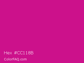Hex #cc118b Color is a normal magenta color and the nearest color is Red Violet #c71585. Hex code #cc118b and RGB value is rgb(204,17,139). In RGB color space, this color is composed of 80% red, 7% green, 55% blue, In CMYK color space, this color is composed of 0% cyan, 92% magenta, 32% yellow , 20% black , In HSL color space, this color has a hue angle of 321° , 85% saturation and 43% lightness.