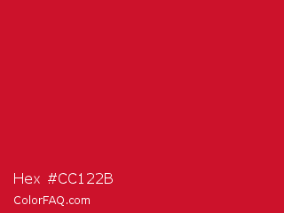 Hex #cc122b Color is a normal red color and the nearest color is Lava #cf1020. Hex code #cc122b and RGB value is rgb(204,18,43). In RGB color space, this color is composed of 80% red, 7% green, 17% blue, In CMYK color space, this color is composed of 0% cyan, 91% magenta, 79% yellow , 20% black , In HSL color space, this color has a hue angle of 352° , 84% saturation and 44% lightness.