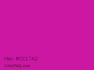 Hex #cc17a2 Color is a normal magenta color and the nearest color is Royal Fuchsia #ca2c92. Hex code #cc17a2 and RGB value is rgb(204,23,162). In RGB color space, this color is composed of 80% red, 9% green, 64% blue, In CMYK color space, this color is composed of 0% cyan, 89% magenta, 21% yellow , 20% black , In HSL color space, this color has a hue angle of 314° , 80% saturation and 45% lightness.