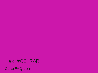 Hex #cc17ab Color is a normal magenta color and the nearest color is Byzantine #bd33a4. Hex code #cc17ab and RGB value is rgb(204,23,171). In RGB color space, this color is composed of 80% red, 9% green, 67% blue, In CMYK color space, this color is composed of 0% cyan, 89% magenta, 16% yellow , 20% black , In HSL color space, this color has a hue angle of 311° , 80% saturation and 45% lightness.
