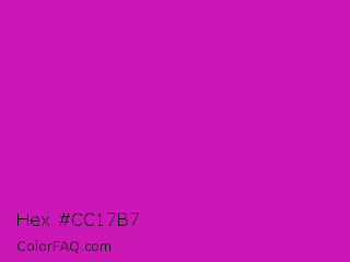 Hex #cc17b7 Color is a normal magenta color and the nearest color is Deep Magenta #cc00cc. Hex code #cc17b7 and RGB value is rgb(204,23,183). In RGB color space, this color is composed of 80% red, 9% green, 72% blue, In CMYK color space, this color is composed of 0% cyan, 89% magenta, 10% yellow , 20% black , In HSL color space, this color has a hue angle of 307° , 80% saturation and 45% lightness.