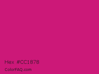 Hex #cc1878 Color is a normal rose color and the nearest color is Magenta Dye #ca1f7b. Hex code #cc1878 and RGB value is rgb(204,24,120). In RGB color space, this color is composed of 80% red, 9% green, 47% blue, In CMYK color space, this color is composed of 0% cyan, 88% magenta, 41% yellow , 20% black , In HSL color space, this color has a hue angle of 328° , 79% saturation and 45% lightness.
