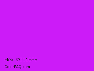 Hex #cc1bf8 Color is a normal purple color and the nearest color is Vivid Orchid #cc00ff. Hex code #cc1bf8 and RGB value is rgb(204,27,248). In RGB color space, this color is composed of 80% red, 11% green, 97% blue, In CMYK color space, this color is composed of 18% cyan, 89% magenta, 0% yellow , 3% black , In HSL color space, this color has a hue angle of 288° , 94% saturation and 54% lightness.