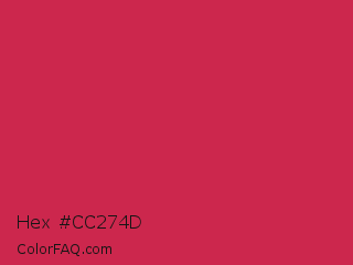Hex #cc274d Color is a normal red color and the nearest color is French Raspberry #c72c48. Hex code #cc274d and RGB value is rgb(204,39,77). In RGB color space, this color is composed of 80% red, 15% green, 30% blue, In CMYK color space, this color is composed of 0% cyan, 81% magenta, 62% yellow , 20% black , In HSL color space, this color has a hue angle of 346° , 68% saturation and 48% lightness.