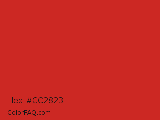Hex #cc2823 Color is a normal red color and the nearest color is Fire Engine Red #ce2029. Hex code #cc2823 and RGB value is rgb(204,40,35). In RGB color space, this color is composed of 80% red, 16% green, 14% blue, In CMYK color space, this color is composed of 0% cyan, 80% magenta, 83% yellow , 20% black , In HSL color space, this color has a hue angle of 2° , 71% saturation and 47% lightness.