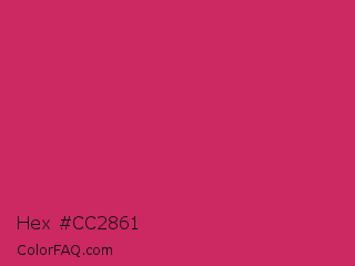 Hex #cc2861 Color is a normal rose color and the nearest color is Rose Red #c21e56. Hex code #cc2861 and RGB value is rgb(204,40,97). In RGB color space, this color is composed of 80% red, 16% green, 38% blue, In CMYK color space, this color is composed of 0% cyan, 80% magenta, 52% yellow , 20% black , In HSL color space, this color has a hue angle of 339° , 67% saturation and 48% lightness.