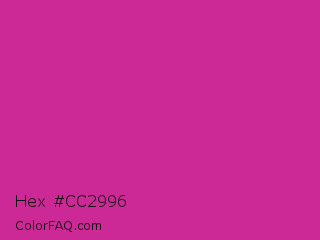 Hex #cc2996 Color is a normal magenta color and the nearest color is Royal Fuchsia #ca2c92. Hex code #cc2996 and RGB value is rgb(204,41,150). In RGB color space, this color is composed of 80% red, 16% green, 59% blue, In CMYK color space, this color is composed of 0% cyan, 80% magenta, 26% yellow , 20% black , In HSL color space, this color has a hue angle of 320° , 67% saturation and 48% lightness.