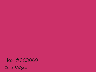 Hex #cc3069 Color is a normal rose color and the nearest color is Telemagenta #cf3476. Hex code #cc3069 and RGB value is rgb(204,48,105). In RGB color space, this color is composed of 80% red, 19% green, 41% blue, In CMYK color space, this color is composed of 0% cyan, 76% magenta, 49% yellow , 20% black , In HSL color space, this color has a hue angle of 338° , 62% saturation and 49% lightness.