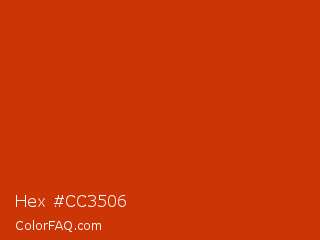 Hex #cc3506 Color is a normal red color and the nearest color is Sinopia #cb410b. Hex code #cc3506 and RGB value is rgb(204,53,6). In RGB color space, this color is composed of 80% red, 21% green, 2% blue, In CMYK color space, this color is composed of 0% cyan, 74% magenta, 97% yellow , 20% black , In HSL color space, this color has a hue angle of 14° , 94% saturation and 41% lightness.