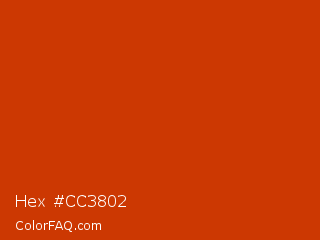 Hex #cc3802 Color is a normal orange color and the nearest color is Sinopia #cb410b. Hex code #cc3802 and RGB value is rgb(204,56,2). In RGB color space, this color is composed of 80% red, 22% green, 1% blue, In CMYK color space, this color is composed of 0% cyan, 73% magenta, 99% yellow , 20% black , In HSL color space, this color has a hue angle of 16° , 98% saturation and 40% lightness.