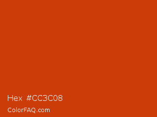 Hex #cc3c08 Color is a normal orange color and the nearest color is Sinopia #cb410b. Hex code #cc3c08 and RGB value is rgb(204,60,8). In RGB color space, this color is composed of 80% red, 24% green, 3% blue, In CMYK color space, this color is composed of 0% cyan, 71% magenta, 96% yellow , 20% black , In HSL color space, this color has a hue angle of 16° , 92% saturation and 42% lightness.