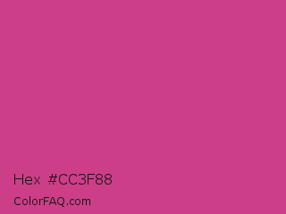 Hex #cc3f88 Color is a normal rose color and the nearest color is Smitten #c84186. Hex code #cc3f88 and RGB value is rgb(204,63,136). In RGB color space, this color is composed of 80% red, 25% green, 53% blue, In CMYK color space, this color is composed of 0% cyan, 69% magenta, 33% yellow , 20% black , In HSL color space, this color has a hue angle of 329° , 58% saturation and 52% lightness.