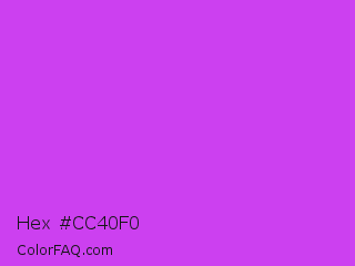 Hex #cc40f0 Color is a normal purple color and the nearest color is Steel Pink #cc33cc. Hex code #cc40f0 and RGB value is rgb(204,64,240). In RGB color space, this color is composed of 80% red, 25% green, 94% blue, In CMYK color space, this color is composed of 15% cyan, 73% magenta, 0% yellow , 6% black , In HSL color space, this color has a hue angle of 288° , 85% saturation and 60% lightness.