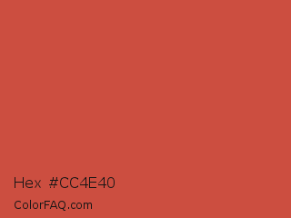 Hex #cc4e40 Color is a normal red color and the nearest color is English Vermillion #cc474b. Hex code #cc4e40 and RGB value is rgb(204,78,64). In RGB color space, this color is composed of 80% red, 31% green, 25% blue, In CMYK color space, this color is composed of 0% cyan, 62% magenta, 69% yellow , 20% black , In HSL color space, this color has a hue angle of 6° , 58% saturation and 53% lightness.